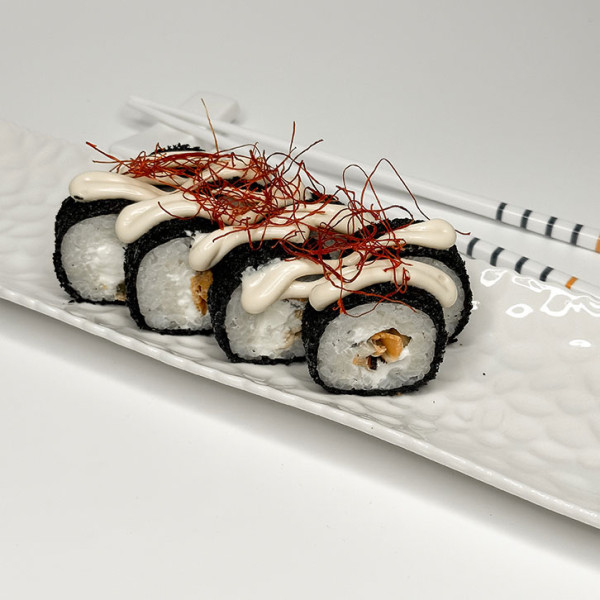 Рис, нори, сливочный сыр, мидии, темпура с чернилами каракатицы, нити чили соус сливочный. 270 грамм 8 шт.