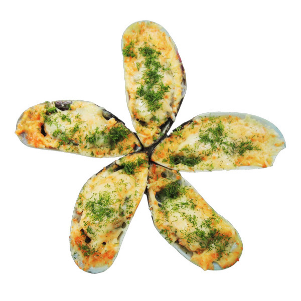 Мидии запеченые под икорным соусом с чесноком и зеленью Количество в порции: 5 шт