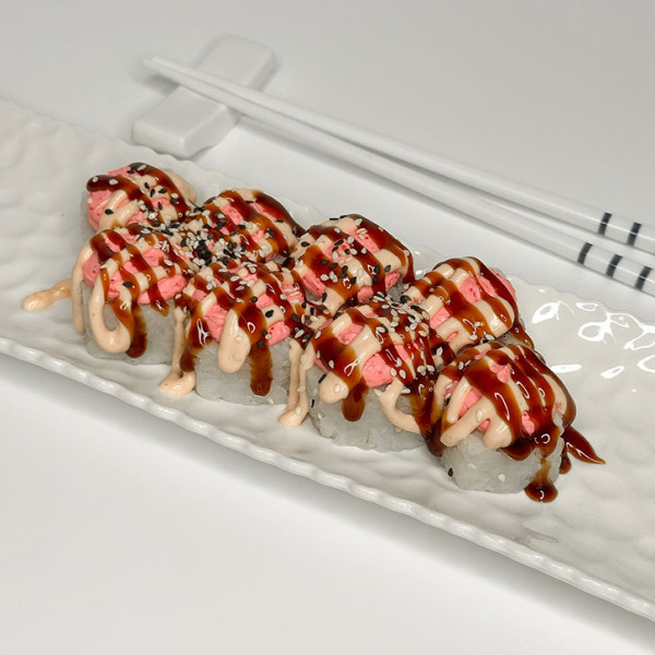 Рис, нори, лосось терияки, сливочный сыр, огурец, сливочный соус, соус унаги, кунжут. 300 грамм