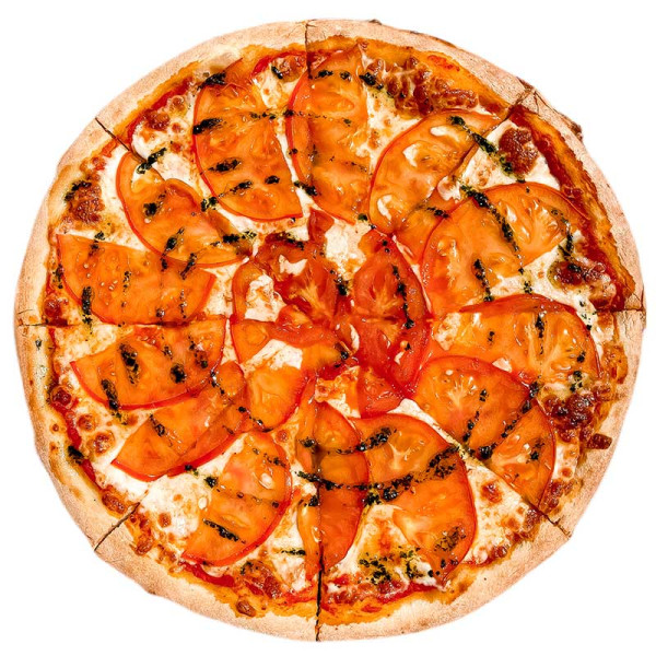 Классическая пицца на тонком тесте с соусом Мутти, сыром Моцарелла, свежим помидорчиком, сочной зеленью. 32 см
