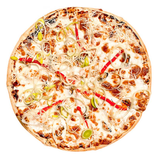 Тонкое тесто, фирменный белый соус, креветка коктейльная, кальмар, мясо мидий, сочный болгарский перец, сыр Моцарелла, сыр Пармезан