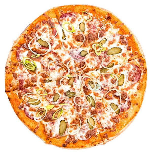 Тонкое тесто, соус Мутти, белый соус, острая ароматная колбаса Пепперони, колбаса Сервелат, бекон, маринованный огурчик, лук, сыр Моцарелла