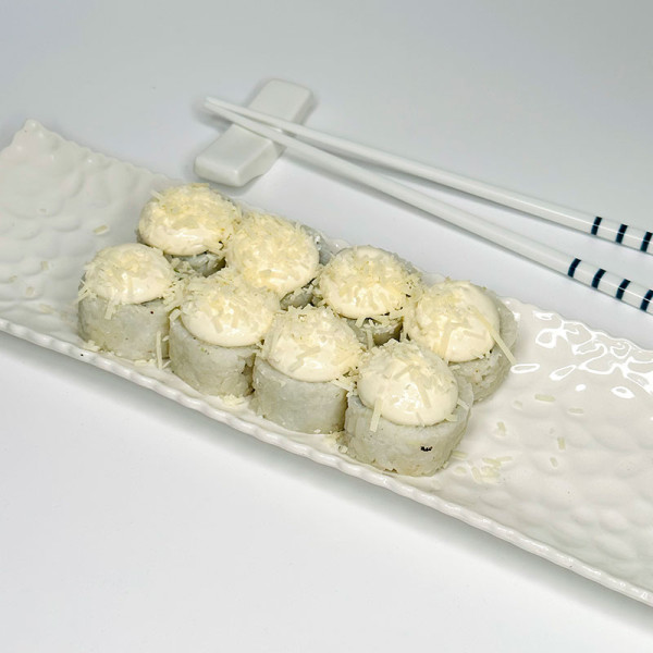 Рис, нори, сыр креметте, копчёная курочка, помидор, лист салата, соус цезарь, пармезан. 280 грамм, 8 шт