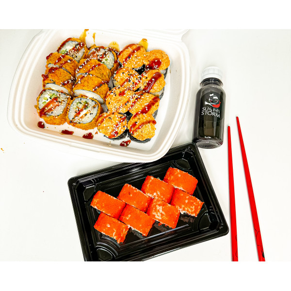 Ассорти из запеченного мидийного, темпурного с сёмгой, и калифорнии с крабом., 24 штук. 800 г.
